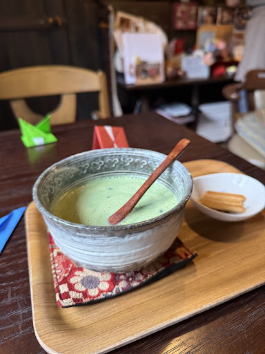 Read moreThe cafe was along houses, not the typical place you expected to find a restaurant/cafe. From the outside, it doesn’t look like a cafe. Manage to find the place using Google Map. This is a small and cozy cafe, there are only 4 tables inside. The customers seems to be regulars or nearby neighbours. 2 of the customers were playing a game of Go. The lady owner was a ex-Geisha. She is 70+ now, but looks like in her 50s. Shop name was the name of her Geisha teacher and the helper is her Geisha student. The lady owner was very friendly. Played us a song and also teaches us paper craft. Drawn a portrait of us, and gave us a CD of the songs she published when she was younger (60+). Seems like she was a Geisha till 60+, but the photo sure look like it’s was 30+ max. Owner was able to speak English, so not an issue communicating or ordering. Like the milk coffee, but the cafe au liat was a little thin. Had a...