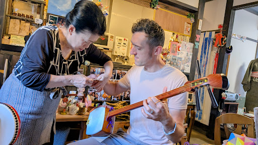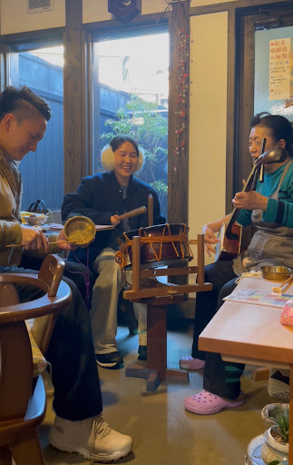 Mimiyo-san made delicious drinks and desserts for us and then taught us to play the Shime-daiko and Surigane. We then accompanied her skilled playing of the Shamisen. What a blast! Along with learning oragami and a traditional Japanese party game, we came to realize that this gem of a spot is much more than a cafe. It seems to be a small local hub of community, entertainment, and friendship, and I am so happy to have been able to be just a small part of it.