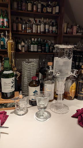 There is a small cover charge and rather upscale feeling to this bar which could be daunting to those looking for a casual night out. But let yourself fall down this rabbit hole and you'll find an intimate and whimsical bar where you are invited to explore a vast selection of whiskey, gin and even absinthe by grabbing the bottles right off the bar yourself! The bartender is a fanatic of his craft and extremely meticulous about each drink, selecting the glass, breaking the ice by hand to the proper size, and garnishing each drink uniquely. Come ready to try something completely new and unique. I had a locally made absinthe and a gin infused with charred tea leaves but he also has a huge variety of American and Japanese whiskeys. I was so grateful to the owner for sampling the Hibiki 21 to me even after I had sadly turned down the rather...