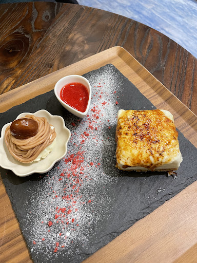 Read moreVery interesting experiencing tasting the brûlée cheese cake. It was perfectly done with the sugar being hard and broken down to eat it. The combination was very tasty, the cheesecake itself being on the subtle side and the sugar on top complimenting. It came with a Mont Blanc, which was unexpected. We also ordered the small pastries, with chocolate and custard. Both the filling and the dough were very nice and super well priced, chocolate one could have had...