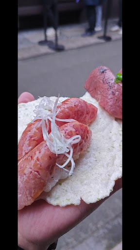 Takayama Old Town, don’t miss the famous Hida beef sushi 🍣 – served not on regular rice alone, but also on a crispy senbei rice cracker 🍘 instead of a plate! This unique style makes it extra fun and photogenic 📸 while highlighting the melt-in-your-mouth flavor of premium Hida beef 🥩. It’s a specialty you can only experience in this area, combining local wagyu tradition with a playful twist, making it both delicious and unforgettable ✨.