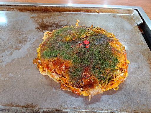 カウンターで焼いているのを見ましたが焼き方も独特。具材と麺を焼きそばを作るように炒めて、生地の上に載せて最後で卵を合わせる感じでした。仕上がりは、たっぷりのソースに紅しょうががのってシンプルなビジュアルです。味も奇をてらった感じはなく、広島お好み焼の王道的な味わいでした。