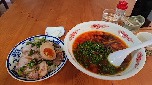 Read more他の方のコメントの通り、そこにあると知らなければ、「らーめん」の幟さえ見落としてしまいそうな民家然とした造りです。九州北部豪雨から復旧されたと伺い、訪ねました。 玄関に飾られている花も、関連業者や贔屓にされている企業だけでなく、他県の学校等からも届いており、これだけで外れのない味だとわかります。 店内は被災からのリフォームか、シンプルながら清潔な造り。普段は不明ですが、伺った際は配膳と接客を奥様?お一人でこなされており、生まれ変わった店内を忙しく働かれていました。美味いらーめんの少しでも早い提供のため、セルフで出来ることは協力したいものです。 注文したのはチャーシュー丼とピリ辛トマトラーメン。 丼のメニューにはチャーシューの切れ端を使うのでお安く提供、とありましたが、切れ端感ゼロ。これより薄くて切れ端同然のチャーシュー麺を出す店をいくつも知っています。味も食感もしっかりしており、丼メインでも全然いけます。 ピリ辛トマトラーメンは、名前から想像するようなクセはなく、普通に美味いラーメン(鶏ガラスープ?)に上手にトマトの爽やかさを上乗せしたようなイメージ。トマト大好きみたいな人がいれば物足りないかもですが、こちらの方が万人受けするのは間違いないでしょう。 他県民ですが、武雄に行く際...