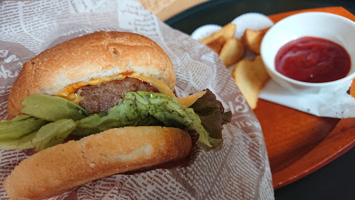 ランチ終了間際14時前でしたが、 ずぶ濡れでなのを見かねて?なのか、 オーダーを受けていただき、 出来たて石垣牛バーガーを食べました!