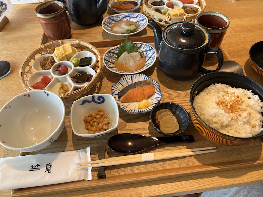 ヴィソンに宿泊して、朝食で訪れました。 朝食を食べながら眺める景色が素敵です。 朝食は、色鮮やかで美味しいですね! 大自然に囲まれたこの場所で薬草湯に浸かり、ゆっくりのんびりくつろいで、気の合う仲間や家族とおいしい和ごはんが楽しめる!! 「笠庵」は、マスター笠原の思いが詰まった、「腕・舌・遊び心」をモットーに繰り広げる日本料理店です。