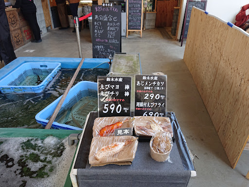 Read more到着して車を停めて最初に気になったこちらで頂いたのは「えびチリ棒 590円」「季節の寿司盛り合わせ 1,680円」そうです。かの有名な鈴木水産さん。店頭の券売機でチケットを発券後、奥のレジでお支払。なんだか…まどろっこしいシステムに感じました。店員さんもあいそがイマイチ。出来上がったら番号で呼ばれます。お寿司盛り合わせ、季節によってお魚の種類が異なるみたい。バラエティーに富んでて、楽しく新鮮なお寿司でした。えびチリ棒、これはアカンやつです。外見は大きいけど、コロモの厚みたっぷり。海老ちゃんはコロモの中で、大人しく縮こまってしましたとさ。こちらは話の種に程度...