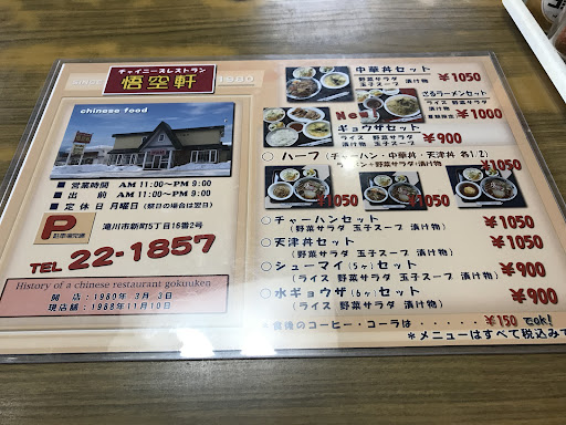 地元のラーメン屋で昔から定期的に通っています。先代から2代目の息子さんに変わっても味は昔のまま変わらない安定の悟空軒。オススメは皮から作る焼き餃子。家族4人で行くと毎回1皿は注文します。んで自分は次男と今回はチャーハンハーフ1050円のラーメンは差額100円増で広東麺。ラーメンもチャーハンも100円増で大盛可能。麺も差額で変更可能です。妻はいつもあんかけ焼きそば900円。長男は塩ラーメン800円。味噌も醤油も普通に美味い。やった事は無いけど、ハーフセットのラーメンを小ラーメンに差額で出来るのかな??出来たら半チャーハンと小ラーメンで850円かも(^^)今度行ったら聞いてみよう。