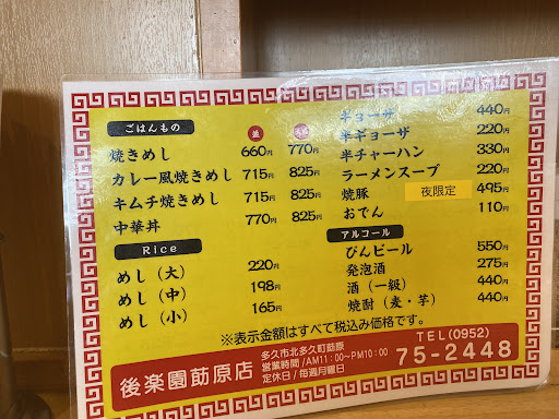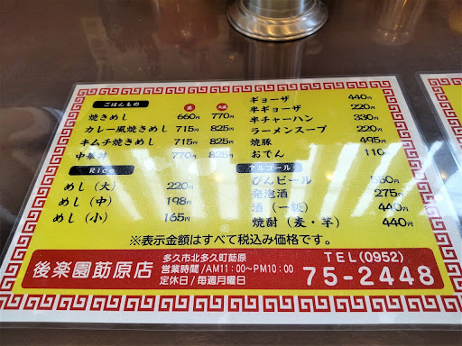 多久市多久町小侍、国道203号線沿いにあるラーメン屋です。やや小さめの店舗ですが、カウンター席·テーブル席·小上がり席がそれなりに用意されています。駐車場スペースは敷地内に整備されていますが、車の出し入れには多少困難を伴います。さて「ラーメン」ですが、透明感のある白濁スープで、あっさりとして優しい味わいの佐賀系とんこつスープとなっています。麺は中細ストレートで歯応えも楽しめます。具はしっとり系のチャーシュー、海苔、ネギといった構成の一杯です。シンプルな作りの典型的な佐賀ラーメンと言えるでしょう。大盛り対応あり、替え玉制ありとなっています。ラーメンのバリエーションはトッピング違いの数種類の他「みそラーメン」も用意されています。また人気の「チャンポン」や「ヤキソバ」「焼チャン(皿うどん)」等、その他麺類メニューも豊富です。サイドメニューでは「焼きめし」が大·並·半と各種ボリュームから選べる他、「カレー風焼きめし」や「キムチ焼きめし」といったバリエーションが目を引きますね。お勧めです。 こちらのお店は、同じく多久市多久町に本店を置く「後楽園」の莇原店として1980年に開業、2016年に店舗をリニューアルして現在に至っております。メニュー展開は本店とは微妙に異なるので、どちらに...