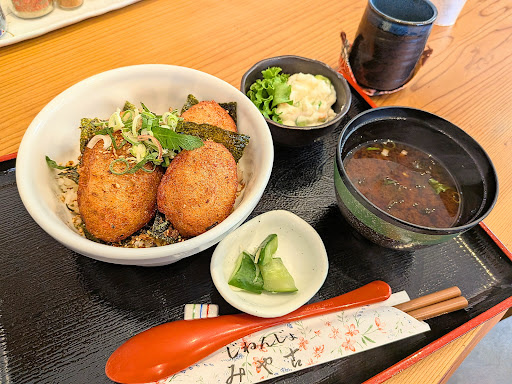 さてトロロ天丼ですが ポテトサラダが少し甘く懐かしく滑らかで美味しいです。 ノリと共にサクサクフラフラに揚げられたトロロが濃くない甘辛のタレを纏ってます。 玉城の地域性なのかご飯が美味しいです‼️ 濃い目の赤だしとキュウリの浅漬けがナイスアクセントでバランスが良かったです(◍•ᴗ•◍...