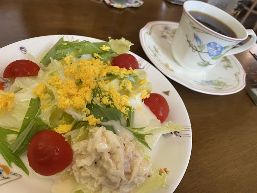 ミモザサラダとホットコーヒーを注文しました。 サラダは至って普通。 フレンチドレッシングがかかっているタイプで、見た目は華やかです。 コーヒーはサイフォンを使っていれる本格的なもの。 風味も味もそこそこ。