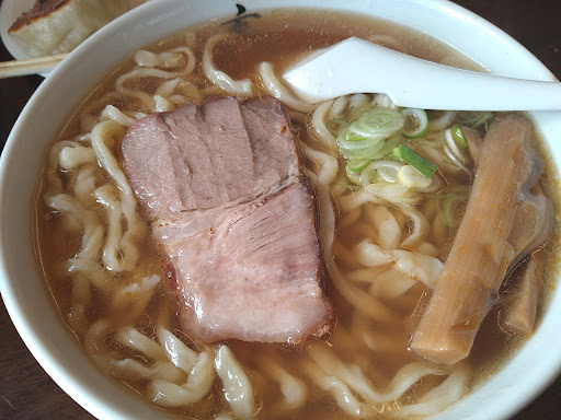 Read more一回目の訪問ではあまりにもピンと来なかったので、少し間をおいて二度訪問しましたが二度目もやはり全くピンと来ませんでした。 手打ちの麺があまりにも独特です。あくまで想像ですが、麺を打つのにおそらく小麦粉とかんすいと塩だけで打っていて、他店が普通に製麺に使う卵や片栗粉をほとんど使っていないような印象でした。そのせいで、随分とずんぐりとした麺という印象を受けます。また、店主さんお一人で一日に大量の麺を作るせいか、麺生地の練り込みも全く足りていない感じで、食感はまるで田舎の農家で出されるスイトンのようなもごもごとした野暮ったい麺として感じられてしまいました。 さらに、麺の表面が溶けかかっていてそれがスープに流れ出すせいで、スープがうっすらと白く濁り、スープに小麦粉の味が混ざった、何とも、もやもやとピントのぼやけた味のスープに感じられてしまいました。もともとガラ出汁が薄いうえに化学調味料をほとんど使っていない印象なのも、味のぼんやり感や弱さにつながっている印象です。 チャーシューは、最初の訪問時はその小ささや繊維の多さから安い腕肉を使っているのかと思いましたが、二回目の物は肩ロースのようでした。二度とも餃子も戴きましたが、この味の弱いラーメンに対して、餃子の食感や味が強すぎて一緒に食べるには残念ながらバランスが悪いと感じました。 また、アルバイト店員の不自然な構成にも強い疑...