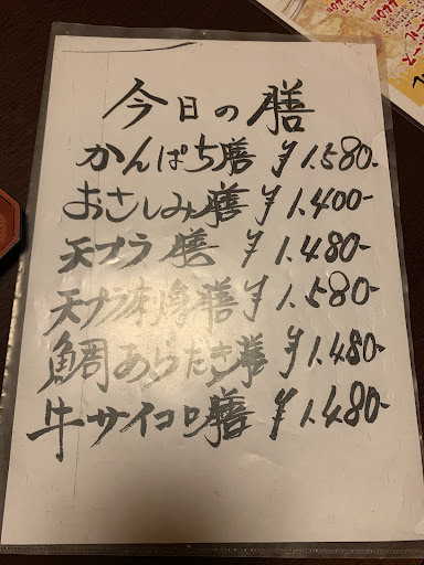 居酒屋メニューに加え『今日の膳』ということで、セットメニューがあるのはありがたいですね。 人気のかんぱち膳を食べたかったのですが、終了していましたので、天ぷら刺身膳をいただきました。 1580円でこのボリュームに驚きです。天ぷらには海老が3尾も入っているし、お刺身も新鮮で美味しかったです。