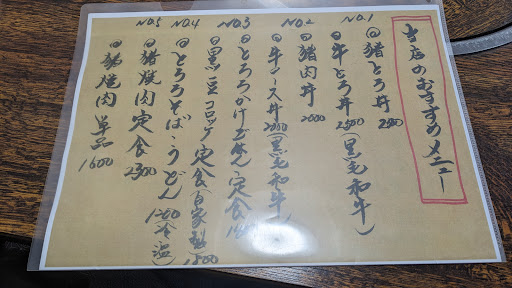 Read more猪肉とろろ丼をいただきました。 外観は町の大衆食堂。お昼時なんで店外に数組ならんで、テレビとかがロケで来たら「外観からしてここ絶対美味しい店!」って言われそうな雰囲気です。 ぼたん鍋風の味噌味ってのも猪肉を食べたかった欲を満たしてくれそうでわくわくしてたんですが…。実際には何を食べてるのかわからないような味。猪肉の臭みとかがあるわけでもなく、固いわけでもない。でもこれ何肉?っていうわけのわからん肉を食ってる感じで、丼の味もハッキリしたものでなく…。ただただ腹が膨れていくだけの食べ物でした。 そしてごめんなさい。何年ぶりか記憶にないですが食べきれず残しました。量の問題ではなく味で。 猪肉とはあっても部位も不明、美味しい猪肉を食べたいならちゃんとぼたん鍋を食べるべきだったと後悔です。いろんなメニューがあるから美味しいものもあるのでしょう...