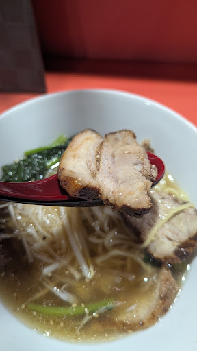 そして塩ラーメンですが、驚いたのは香菜が入ってました 私の大好物の野菜です そして、そして、なんと言ってもチャーシューです! このチャーシューが美味しくて美味しくて 噛めば噛むほど味が じゅわっ と出てくる 飲み込むのがもったいないと思いながらもゴクリ スープはあっさりコクがあり美味しいのでガブ飲みでした