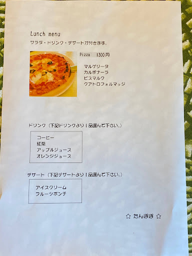 Read more日曜日ランチタイムに行きました メニューのコース自体は: ・ピザ各種単品、ミートグラタン(900円) ・ピザorグラタン「ドリンクセット」(1200円) ・ピザorグラタン「サラダ、ドリンク、デザートセット」(1500円) のみでした。 ※飲み物はドリンクバー形式 それぞれの料理の大きさ自体は少なめでしたので、ガッツリ食べたい人には物足りないかもしれないです、ただ数人で行ってそれぞれが違うメニュー頼んでシェアするようなちょっとしたランチには最適でした。 提供する人、料理する人が一人ずつなのかな?提供自体は早くも遅くもなかったです、ただお店が満席とかだったら順番での対応なので、行く前に電話するなり、時間の余裕は必須ですね。 味は良かった、美味しかったです。 ただメニューでの写真など無かったのでデザートのイメージが口頭説明だけで...