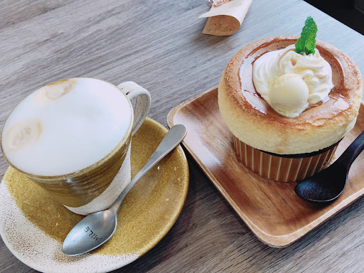 口コミを拝見してスフレが食べたかったので、私はプレーンのスフレをカフェラテで、連れはラムレーズンをホットコーヒーでお願いしました。 オーダーが入ってから焼き上げるため暫し待ちますが、それもわくわくしました。卵の泡だててる音聞こえたり…♪
