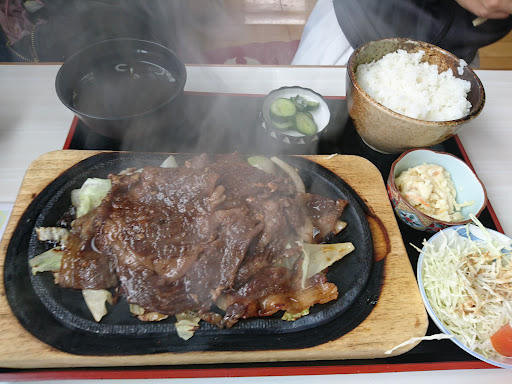 尋常ではないほどの蒸し焼き湯気が、乗せられた鉄板から焼肉臭とともにやって来ました。