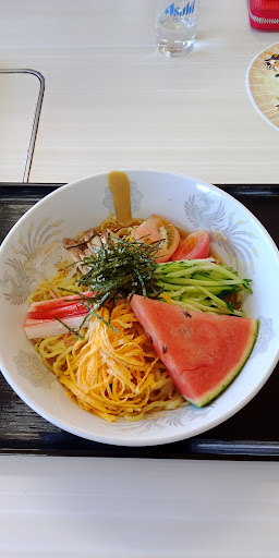 我々の分が到着したのは 「冷やし中華」が20分後 「和牛バラ肉焼き定食」はその後調理開始 25分後に着丼。とはいっても着丼のビジュアルは最高でした。 しょうがないとはいっても時間がかかりすぎ。 ビジネスランチには不向きですね? 冷やし中華には冷えたスイカと大きな氷が入っていました。 全体に量が多い感じでしょうか?