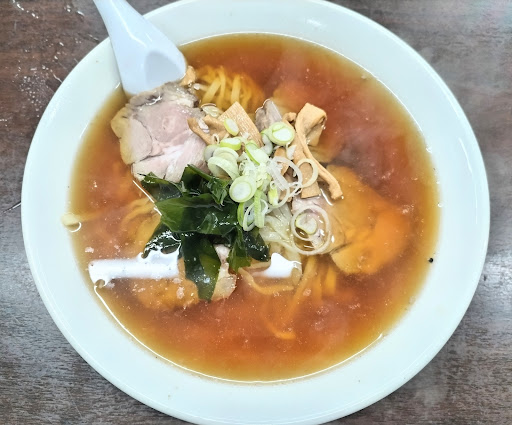 殆ど脂が浮いていないスープは、豚肉と香味野菜ベースで、醤油の褐色が映える見た目とは違い、穏やかな塩味であっさりしています。 手打ち麺は、硬めに仕上げられ、小麦感の強いモチモチ食感で、これは美味しい