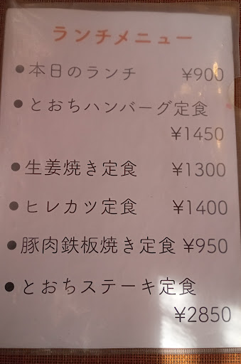 Read more12時30分頃入店。 駐車場は店のウラ側に10台くらいあります。 人数を告げると、空いている席にどうぞとのこと。 席に着くと、お水、おしぼり、お箸、漬け物が提供されます。 席はカウンターが6席、テーブル席が3卓、小上がりがあるみたいでした。 卓上には、しょう油、ソース、コショウ、お塩、七味唐辛子、紙ナプキン、つま楊枝、メニューが置いてあります。 生姜焼き定食税込1,300円、相方はとおちハンバーグ定食税込1,450円、もう1人がヒレカツ&海老フライ定食税込1,450円を注文。🙋 約10分で着丼。🐴🌿 熱々の鉄板の上には、ややしょっぱめの濃い味付けの豚ロース肉が2枚、付け合せには、甘い味付けのニンジン、フライドポテト、たくさんのサヤエンドウが付いていました。 ご飯はやや硬め、量はやや多めで、みそ汁は、熱々🔥火傷注意🚨で、具は豚肉、豆腐、タマネギ、ダイコン、ミツバが入っていて、濃度はちょうど良い塩梅でした。 漬け物は、ぬか漬けで自分好みでした。😋 デザートは、オレンジが付いていました。 ハンバーグは、ジューシーで上にキノコのデミソースととろけるチーズが乗っていました。 ヒレカツは、とても柔らかかったです。 価格はちょっと高めですが、ご飯がススム味付け、ボリューム共に、自分に...
