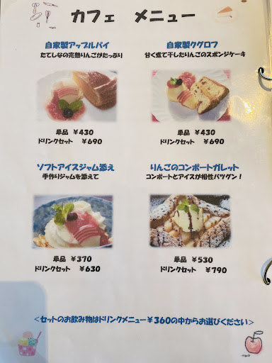 The apple pie, and apple juice are both delicious, and can be bought to take home as well as eat in store. They have a varied range of meals available, including curry, and the prices for everything seem very reasonable. Apple pie with ice cream, and a drink, is only 600yen.