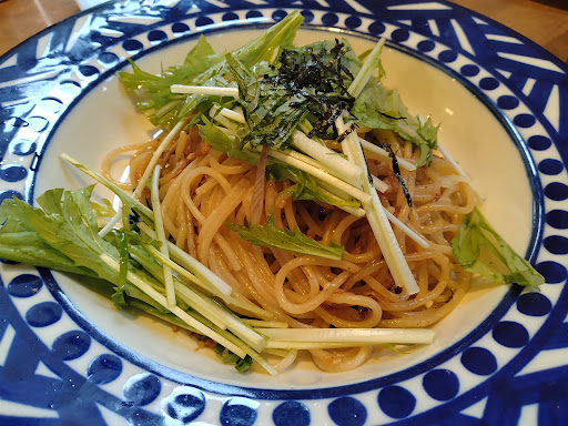 連れはきまぐれプレートランチ(とんかつの甘辛煮)と本日のパスタランチ(塩こうじ豚のトマトソースパスタ)を注文。 なお、全てのランチにはサラダと副菜4種が付きます。