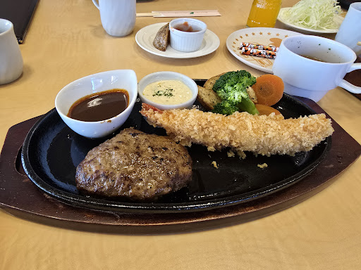いつもいつも出先では海鮮物ばかりで、少々飽きた感が。 で、肉を食べたい!となり、千葉で果たして美味しいステーキなんぞ見付かるのか?と探し当てたのが、こちらのレストラン。 どうせなので、限定数のサーロインステーキを。 房州は里見伏姫牛のステーキ。 房洲に地の牛が有ったとは。 結論・・・旨い!! 口に入れて一噛み、二噛みと肉汁がジュワ~っと。 しかも、決してキツくはない脂感。 肉質も柔らかく。 臭みも殆ど感じられません。 肉々しいのが好きな方には、少し物足りないかな? タレが2種類付いてきますが、何も付けずにイケますよ! 味変で2、3漬ける位で。 ホントはご飯をもっと食べたかった。(^_^;) 同伴がリブロース頼んだけど、つまみ食いするの忘れた💧 美味しそうでしたよ! ステーキが食べたくなったら、ここがお決まりコースになりそです。 気軽に入れる感じで堅苦しくないので、気楽に食事出来ます。 ゴルフ練習場と併設なので、マニアックなのか?お昼時でも空いて...