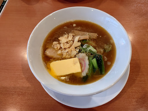 注文したのはにんにくバターらーめんで、にんにくというより、バターが強めな味でした。チャーシューも乗ってますが、まぁ値段相応かと。 最後にスープの飲み干す時に、トッピングで乗っていたニンニクスライスが沈殿していたので、一気にニンニク感が増しました。個人的には、テーブルニンニクが置いてあると嬉しいかな。