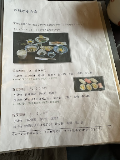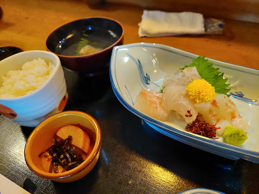 到着してメニュー見てたら、店主らしき爺さんに会席と寿司を勧められたけど、何かイマイチっぽいんで、白身刺身定食1700円2つと穴子丼定食1700円をオーダーしたら、あからさまにいやな顔をされ、「定食は予約取ってない。定食で座敷占領されたら売り上げ上がらん。ウチは定食が配膳までに1番時間が掛かる。」とのこと。