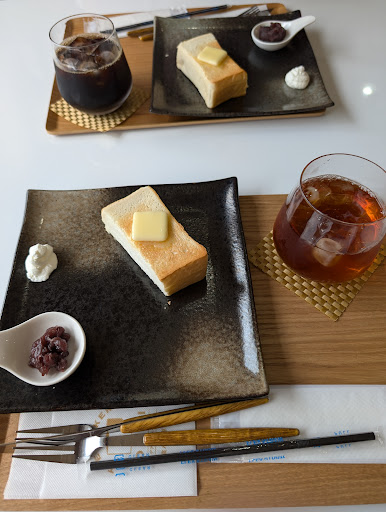 Read more写真のトーストはイートインで飲み物を頼んだら、無料でついてきました😊 ふわふわで程よく甘いトーストにバターの塩っけが最高に美味しく、小倉あんをつけて食べても幸せの味…! フルーツサンドを目当てに行ったのですが、落着いた雰囲気の綺麗なカフェスペースがあってすごく得した気分になりました