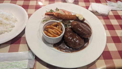 24号線信号付きの千代中三叉路スーパーエバーグリーンの向かいに10台以上停められる駐車場があります。まず車を止めてゆっくり2階の一番奥のお店を探してください。 いただきます。 何種類かあるランチセットメニューでは、コーンポタージュスープが初めに出てきます。 ワンプレートのハンバーグ、ポークカツレツ、エビフライ、小さなサラダにライスかパンが付きます。 衣はサクサクしています。しっかりトマトの味がするデミグラスソースは本格的です。とってもおいしかったです。 ごちそうさまでした。