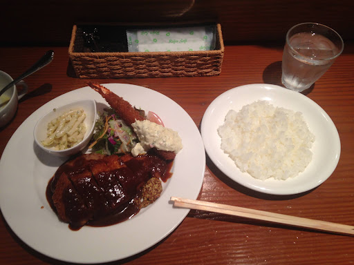 Parking area for 10 or more faced the supermarket named "エバーグリーン(evergreen)" is available at the three way junction of "千代中(Chishiro-naka)" with traffic signal. At first, you must park your car, and then you can take time searching the restaurant located the innermost on the upstairs. ITADAKI-MASU The corn potage soup was served at the start in the several lunch meal sets. The hamburger steak, pork cutlet and deep fried prawn with small portion of salad was served in one plate with rice or bread. The batter was very crispy. The brown sauce (demi-glace) remains the sour taste of tomato. Yummy, Yummy. Tips: The waitress, probable chef's wife, is a neat and clean beauty in Japanese...