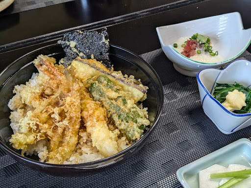 Read more12時に入店。ランチで利用 天丼オーダー。 天ぷらは、海老、鱚?、エリンギ、海苔、ナス、しし唐 天ぷらの衣のまとわせ方がすごく良い。 タレも甘ったるい感じでなく絶妙な味。 小鉢はその時々で変わるので、飽きが来ない。 お茶も相変わらずうまい。