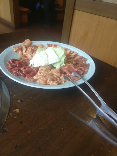 しかし なかなか品物が揃いません。 仕方ないので、しばらくキャベツ焼いて齧ってました。 ようやくカルビ 次いでイカ焼き、だいぶ待って冷麺。 ネギ玉ライスが配膳されたのは注文してから30分を軽く過ぎてました。 もうちょい早いとよかったね~。