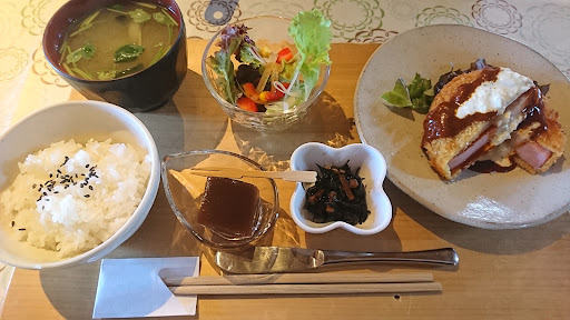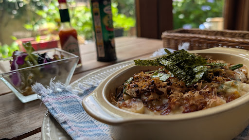 平日の12時頃に到着、店舗横の駐車場に車を停めて店内へ。窓際の明るいテーブル席が空いていたので着席。薬膳ランチがおすすめだったけど、高菜入りオムライスとドリアをオーダー。 しばらく待つ間に見回すと、窓からは明るい緑溢れるガーデンが見え、オシャレな雰囲気にゆったりした時間が流れます。 しばらくで配膳された高菜入りオムライスは、和風出汁のごはんに高菜のパンチが効いていて美味しいオムライスでした。 ドリアもカツオ出汁が効いた和風ドリアでこちらも美味しいです。 ドリンクなしのランチで1400円、ドリンク付だと1800円とちょっと高め。 そしてごはんの量ももうちょっと欲しかったかなと感じたが、女性にはちょうど良い量かもしれません。 食後の珈琲をいただきがら少し読書。なんて昼下がりを過ごすには...