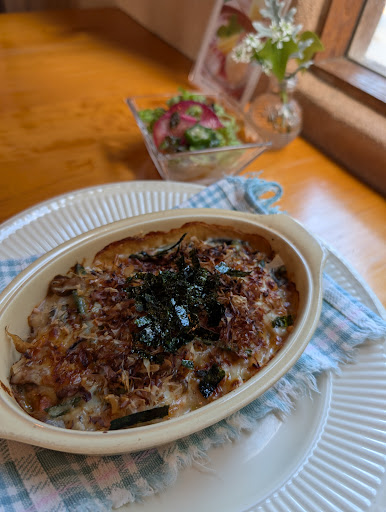 Read moreずっと前から気になっていました。 11時からランチでの訪問です。 木の優しい感じが伝わる店内で、一階は天上が高く開放感がありました。 注文したのはきのこのドリア。なんでしょう、クミンが効いたようなご飯で、これがすっっごく美味しい!!! ドリア好きの私ですが、ここのドリアは癖になりそうです♪♪ ケーキは季節限定のカボチャのモンブランにしました。これもすごく美味しいー! 滑らかなカボチャが程よい甘さでやみつきです♪♪ 駐車場があるのも嬉しいですし、美味しいご飯とお洒落な空間を味わいたい...