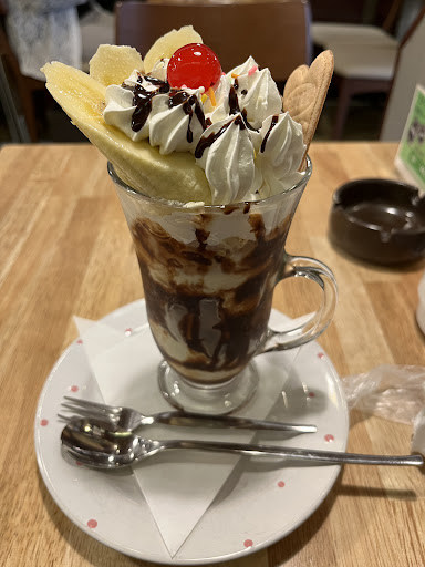 Read more天理大で資格試験があった帰り、店先のサンプルに惹かれ立ち寄りました。チョコレートパフェとアイスコーヒーを注文。レガシーな雰囲気満点のパフェはホイップクリームの上にちりばめられたカラースプレーに心踊ります。トッピングのバナナは大きめカットで満足感と食べごたえ抜群。フルーツとチョコレートアイスとホイップのバランスが絶妙で冷たくなりすぎず、アイスコーヒーをお供に頂いても体が冷えすぎたりせず良かったです。コーヒーのアテについてきたアーモンドも美味しかった。 昔ながらの喫茶店の雰囲気を残しながらもWiFiやコンセント完備、電子マネー可、などと利便性も高くとても好印象です。楽しいひと時を過ごすことができました。喫煙OKなのも嬉しい。また天理に来た折りには立...