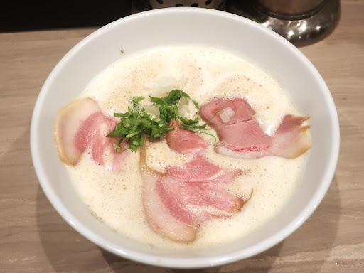 ◆特製TORI 白湯らーめん(醤油) 麺大盛 価格 1,080円+160円 醤油ラーメンなのにあわ立って真っ白なスープ。 その上にレアチャーシューが3枚、煮卵、刻み生玉ねぎ、刻んだ水菜。 ひと口スープを飲むとエスプーマで円やで優しい~。 麺をすすると、ぷにゆっとした加水率高めのもっちり麺で良い麺だ。 ただ、麺と合わせるとスープがちょっと円やかすぎるかな。 更にはすごく円やかで言われないと醤油と分からない。 麺をすすった後にスープもひと口飲むとちょうど良くなった。 そしてお待ちかねのレアチャーシュー。 ひと口食べたらこのレアチャーシュー...
