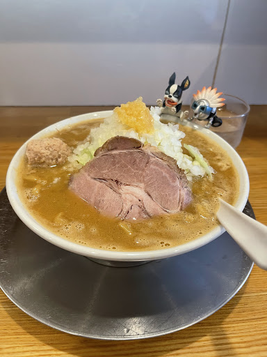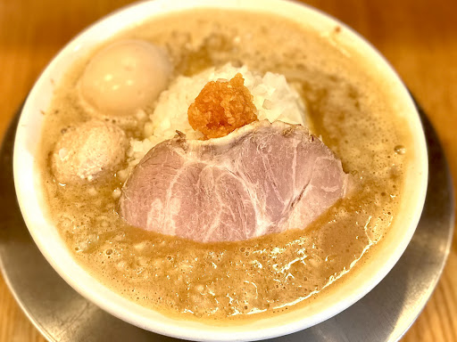 Read more数日程前店前を通った時に大行列が出来てるのを見て気になり今日5月2日雨中食べに来ました。 百名店に選ばれる程の人気店ということで車で1時間前に店前に到着。既にお2人外の椅子で待たれていました。 店前に駐車場スペースがありますが大型車は停めにくいかもしれませんね😅 営業開始時間になり店内へ入り魚介豚骨 全部のせ(並)の食券を買いにんにく有り無しを聞かれたので今回はなしと伝え席につき15分程して着丼。 スープは少しドロっとしていているものの見た目以上にあっさりとしており飲みやすく麺も太めの縮れ麺で食べ応えがありチャーシューも柔らかくキャベツ・もやし・微塵切りにした玉ねぎの甘みも合って特に鶏つくねの団子は生姜もしっかりと効いて最高でしたね。鶏つくね大好きなのでこれだけでご飯と食べれる笑 煮玉子は中身が半分固まっていたのが残念でしたね。個人的に煮玉子はトロッとしてる方が好みなので。 ただ食べてる内に少し胸焼けしていつもならスープは完飲しますが半分程残しました😅 いつもは大盛りにしますが並でも麺が200gと多く全乗せにするとボリュームも増して結構お腹いっぱいになりますね。