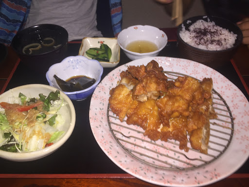 Ordered the fry-chicken set for lunch. skin is crispy and meat is juicy. the dipping sauce for chicken has vinegar in it. very good match. and I had the best miso soup...ever..... i think they use a seafood base or at least shrimp based. go if you are...