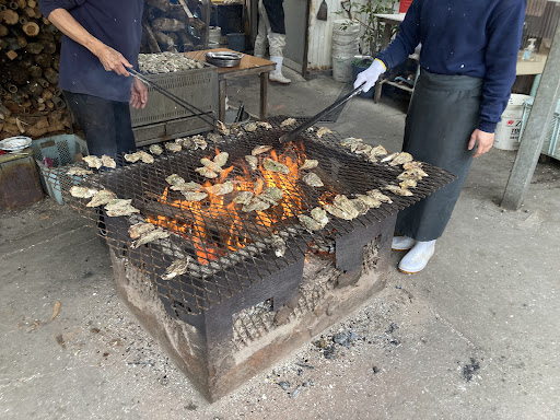 海沿いの牡蠣小屋がたくさん並んでる界隈にあります浜英(はまひで)水産さん。 駐車場は牡蠣小屋の目の前にあります。 外では焼き牡蠣が大量に焼かれてます。