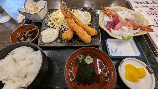 鳥羽旅行の際に利用させて頂きました。 街中で食べようと思ってましたが口コミやネット情報を見るとどこも観光所価格。 悩んでいた所、駅直結でふらりと一番街に立ち寄ったらどのお店も良心価格だけどどこもメニューは似たりよったり。 えびしまさんにした決め手は優しそうなお母さんだったので。家庭的な雰囲気がよかったです。 お刺身付海老フライ定食を頂きました。 海老フライが美味しい!弾力がある! なによりタルタルソースがついてるのが◎ お刺身も豪華!いかが柔らかくて甘い、海老おっきい!6種類も入ってる! 付け合せの小鉢も漬物もついてこのお値段と味なら大満足です! 食べ終わってお店を出た後に口コミを見ました。 たしかにパッとしない入口ですが、穏やかに食べられて、お母さん達も優しくて一人...