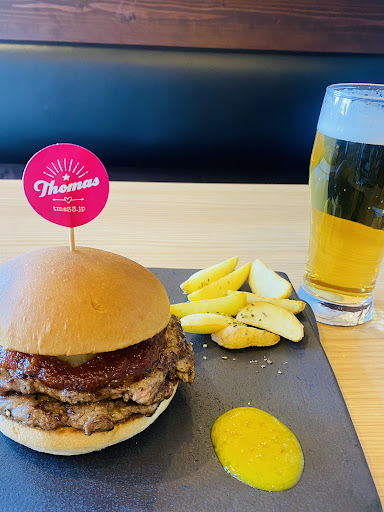 ナイフとフォークもありますが、豪快にかぶりつき! 肉肉しくて美味い!! トーマスバーガーのソースはピリ辛。 バンズも柔らかくてほのかに甘い。 スライスされた玉ねぎも良いアクセントになってる。