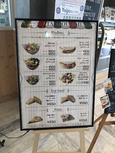 立て看板にある「Piadina(ピアディーナ)」が気になるから食べてみようかな(^-^)/ 看板に書いてある説明によると 〜 ピアディーナ 〜 「丸く焼いた生地に様々な食材を挟んで食べるイタリアの伝統的な国民料理」 だそうです 全然違う知らなかったけど、イタリアではピザと並んでポピュラーなものだそうです