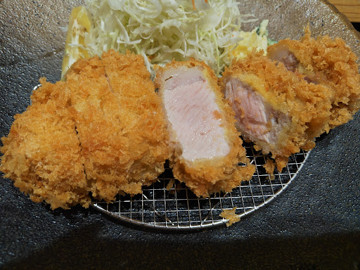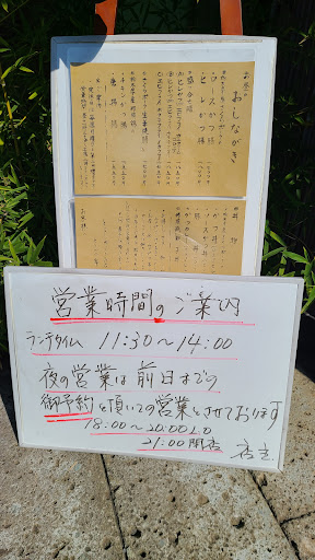 Read moreせっかくグルメで紹介されたお店で、とても美味しかったです。 夜のメインメニューと営業時間など基本情報の写真を添付しました。 私が注文したのはロースカツ膳200g2,300円で、極厚の断面に気持ちが上がりました。汁物が2種類から選べて(今日は豚汁とアオサのお味噌汁でした)、ご飯、漬物、小鉢、千切りキャベツ、最後にミニシャーベット(今日は柚子)が付いてました。 カツに付けるわさび塩、ソース(とんかつソースとウスターソース)、ピンク塩、七味、辛子なども好きに使えます。 その他情報として、 11:30開店の10分前から駐車場で待機、開店と同時に店内に一番乗りしました。 その後、続々とお客さんが来店してて11:45頃には満席になってました。スムーズに着席されたい方は、予約をお勧めします。 また、料理の提供時間は長いです。それはロースカツもヒレカツも低温の油でじっくり時間をかけて揚げて、高温でカラッと揚げるからだそうです。気長にゆっくりお待ちください。 最後に、カツは結構なボリュームです。料理を残しても、店員さんに持ち帰りのパックをもらうことが出来ました。無理をしな...