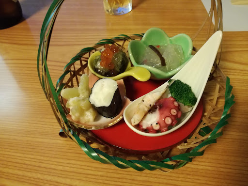 Read moreお店を見た時に「しまった」と思ったが(笑) つきだし(お通し)を見て「こりゃ当たりかも」と。 つきだしが凝っている。 「いくらとあわびとオクラの和え物」「たこ」「数の子のわさび和え」「くらげ」「マッシュポテトののり巻き」・・ お刺身の盛り合わせも「ほたて」「マグロの赤身と中トロ」「シマアジ」「金目」「クエ」「イカ(もんご?)」 夏野菜の煮浸しに大根おろしを載せたもの。 これも美味しかった。 つきだしもお刺身も煮浸しも全部美味しい。 ゆいいつ残念だったのが「鮎の塩焼き」 出てきたらでかい! 案の定冷凍品で皮が固く身がボロボロ。 これじゃ...