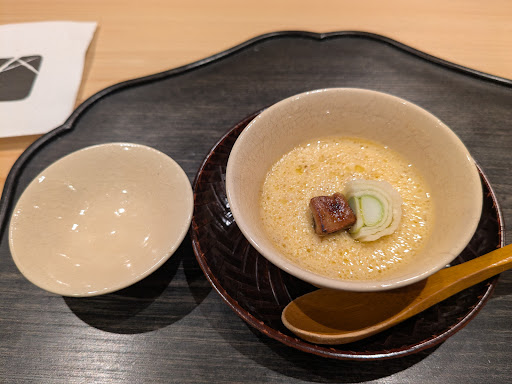 ○鰯の明太胡瓜巻き 丁寧な刃打ちに自家製ガリがアクセント、見た目も美しいアーティスティックな巻物。 ○鮑の茶碗蒸し ここで鮑です、茶碗蒸しにての登場が嬉しい限り。 ・惣誉 純米吟醸 栃木県産五百万石(惣誉酒造)