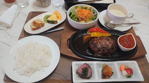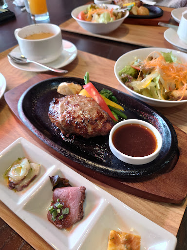 評価が良かったので、初来店。 お店の雰囲気は良かったです。 個室もゆったり綺麗です。 誕生日に予約して コース料理を注文しました。 メインはハンバーグやステーキなどから選べます。金額アップの記載がなく、ヒレステーキを注文したところ、プラス500円との事。メニューに記載すべきではないでしょうか? 個人的には、ステーキは塩で頂くのが好みですが、こちらはタレをつけても輸入牛?臭みがきつく感じました。また焼き加減は聞かれず、かなりのウェルダンでカチカチで残念でした。 前菜やピザは美味しく頂きました。スープは、コンソメ。 デザートプレートがセットに付いていますが、そちらに、サプライズメッセージを付けてもらえません⤵️もう1皿注文する事になり、デザートが3皿になりました。このパターンは初めてです。こちらはのお店は、ランチのハンバーグが高評価なので、ハンバーグにしたら良かったかと思いました。