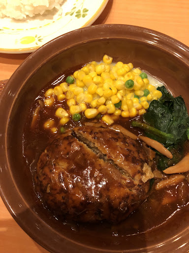 久々にイオン栃木店寄ってみましたら寂れ感が半端なく伝わり哀れさえ感じてきました。まぁ、従業員の半端ない高年齢の多い事それとエスカレーター付近の椅子にはその上をいく後期高齢者、一瞬どこぞのナンチャラ荘かと思ってしまいます G.Gカードは皆さんお持ちなんでしょうか? 時間はお昼時間も過ぎなんかたべたいなぁと思っていて軽くでしたら、フードコートでもいいかで探したら、板張りのみのインドカレー屋一軒のみの営業、流石にそれは無いわなって感じでロッテかケンタも食欲湧かず、外でもと考えたけど一つの光が射すようなサイゼリヤを発見してしまいました。もう、神々しく見えて吸い込まれている自分が居ました。で、時間的にランチ500円に引かれてもあったのですけどね。でチョイスしたのが、 きのこソースのハンバーグでした。まずはスープと水は自分で持ってきやがれ案内で取りに行くと具なし醤油味スープ発見し、お冷やも確保して席に戻るとポツンとサラダが置かれています、見事なサーブにちょっと驚きでした。で、サラダを醤油スープで流してると、ハンバーグ到着です、ライスと一緒に、鉄板が熱いですよの要らない注意とかあって、いざ、実食となったのですがハンバーグの小さい事、まぁランチ用なんでしょうが、ガロニのコーンよりも面積が小さくて、あぁ値段相応なんだと納得しました!お得感ゼロのお昼ご飯でした。でも、美味しかった...