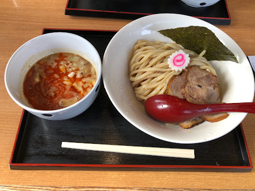 Read moreいつもは油そばかつけ麺を食べるのですが、今回は辛つけ麺にしました。 麺は並盛(200g)、大盛(300g)が通常価格、特盛(400g)が+100円、鬼盛(500g)が+200円、気合い盛(600g)がプラス300円と大盛がお得なので、大盛にしました。 麺は全粒粉のコシがある太麺で、つけダレはどろっとした濃厚な魚介系で玉ねぎの微塵切りがアクセントになっています。 ラー油がかかっていますが、それほど辛くは無いので、テーブルにある一味唐辛子をかけると好みの辛さになると思います。 トッピングは薄切りチャーシュー2枚と鳴門と海苔が麺に載っていました。 チャーシューは柔らかくて下味がしっかり付いていて美味しかったです。 食べ進むと、つけダレの中に太目の柔らかいメンマと角切りのチャーシューがゴロゴロ入っていて、これもなかなかいい味でした。 最後にカウンター前にあるサービスの割りスープでつけダレを割りましたが、つけダレが濃厚なためか、麺に良く絡んだせいか、殆ど残っていませんでしたが、何とか少し飲めました。 普通のつけ麺と変わらず、な...